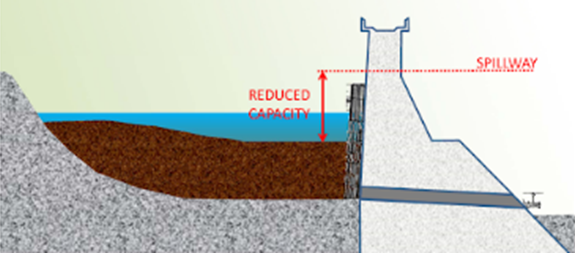 - Sediment is made of soil, sand, and rock that is eroded by storms and carried from hillsides into streams and reservoirs. Over time it accumulates within the Reservoir, reducing water storage capacity, and blocking the Dam’s intake gates, risers, and valves.
