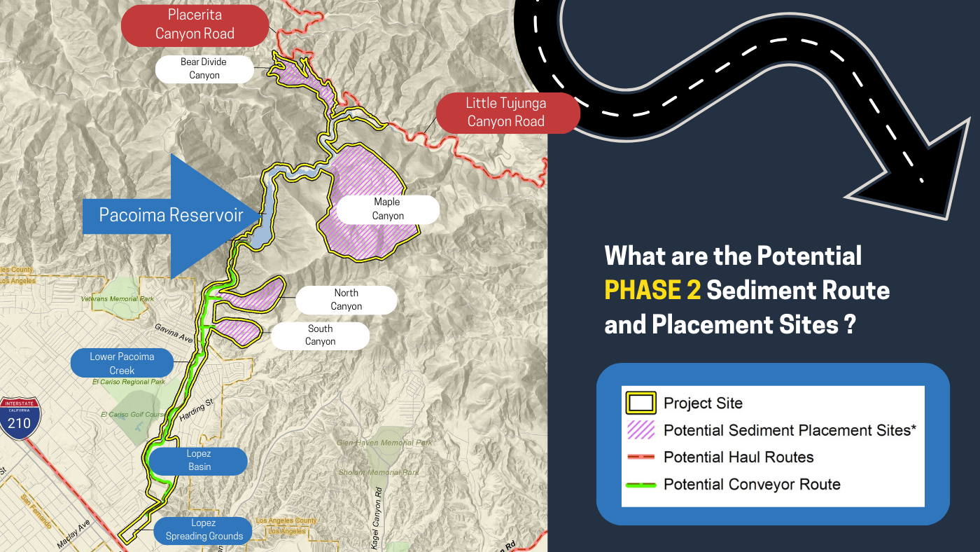 - The Pacoima Reservoir’s lowest outlet valve is currently buried under 80 feet of sediment. If 20 additional feet of sediment build-up, all of the Reservoir’s other outlet valves used for storm operations will be blocked and the Reservoir will become inoperable.